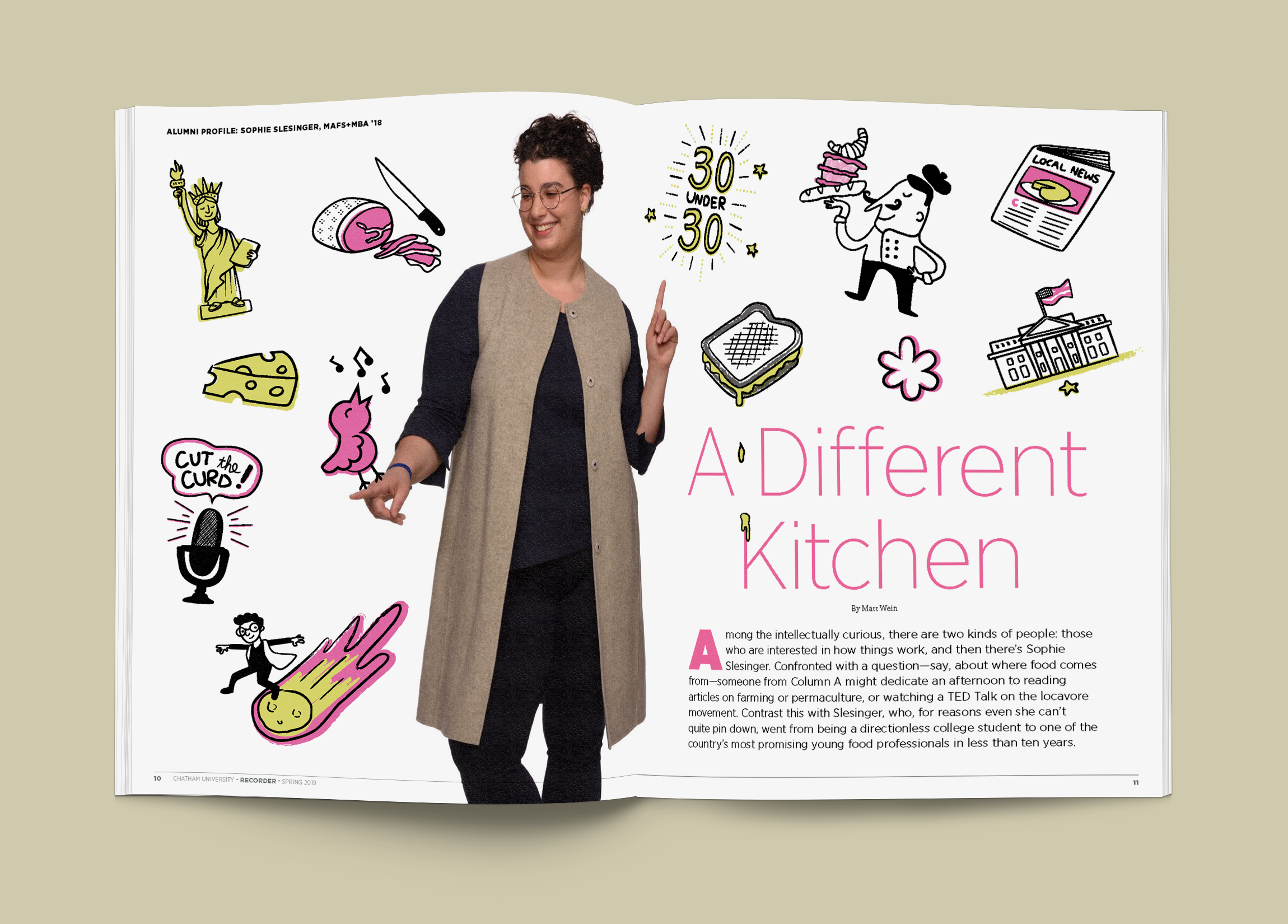 I was asked to create a series of whimsical "doodled" illustrations to accompany a story in Chatham's 2019 Spring Alumni Recorder. Working with our senior design team, we selected words and phrases from the article that would translate well to doodles. Our color palette was pulled from the photograph on the second spread, creating a sense of unity between the photographs and the illustrations.