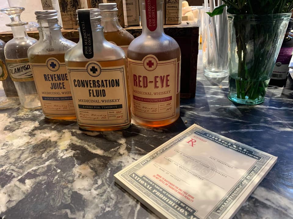 In 2019 I worked with Wigle Whiskey to design one of the themed areas in the new event space at their Strip District location. I conceptualized and developed graphic design pieces for an area inspired by Andrew Mellon, medicinal whiskey, and the prohibition era. I designed several fake "medicinal whiskey" bottle labels as well as a "medicinal whiskey" prescription pad. The bottle labels were inspired by medicine bottle labels from the 1920's and 30's, and the prescription pad was influenced by historic medicinal whiskey prescription pads. The event space opened in late March 2020, and the prescription pads were adapted as postcards to be sent out with mobile whiskey orders during COVID-19.
