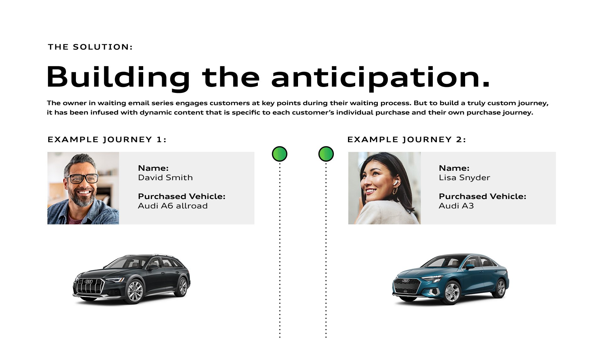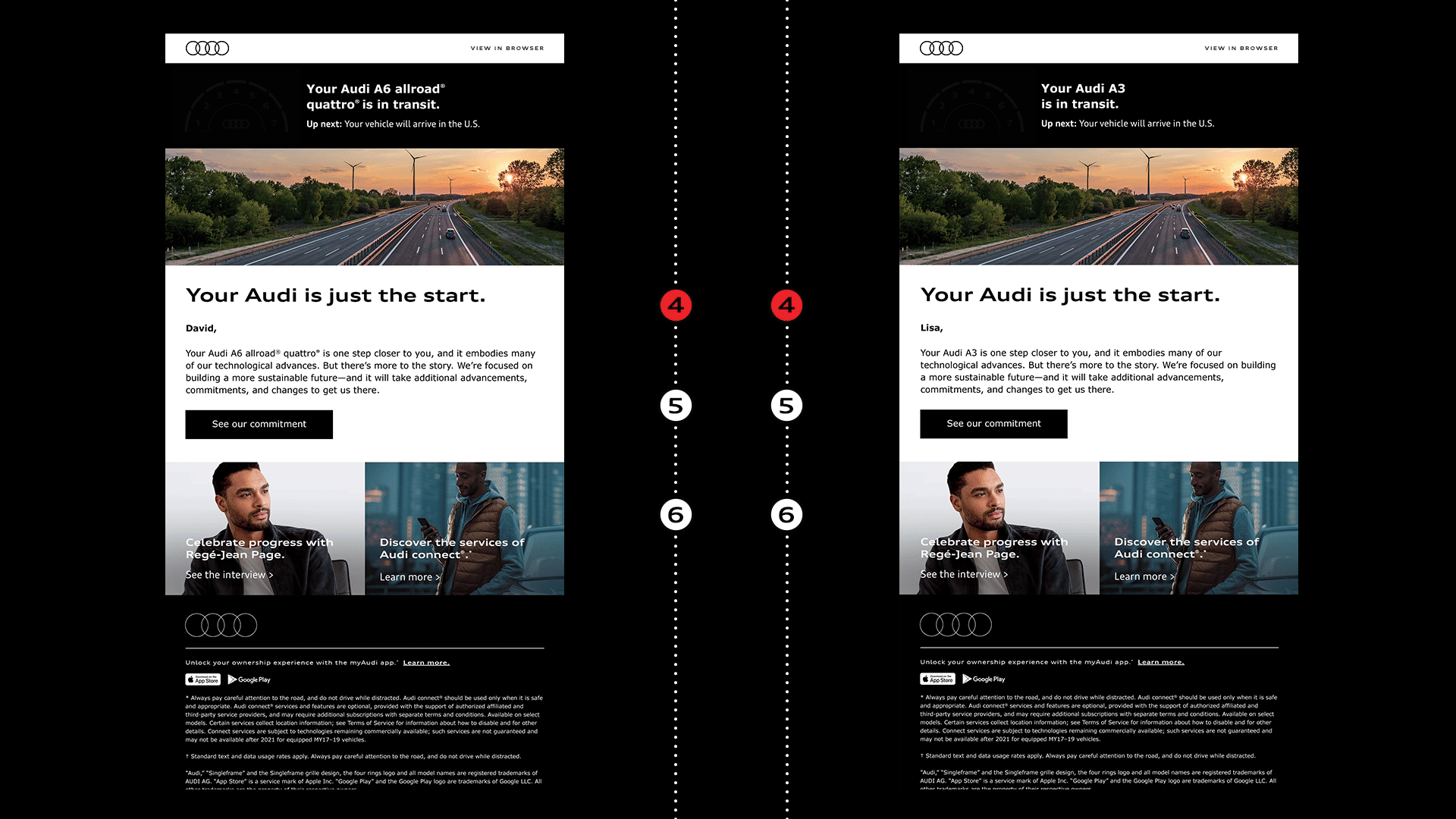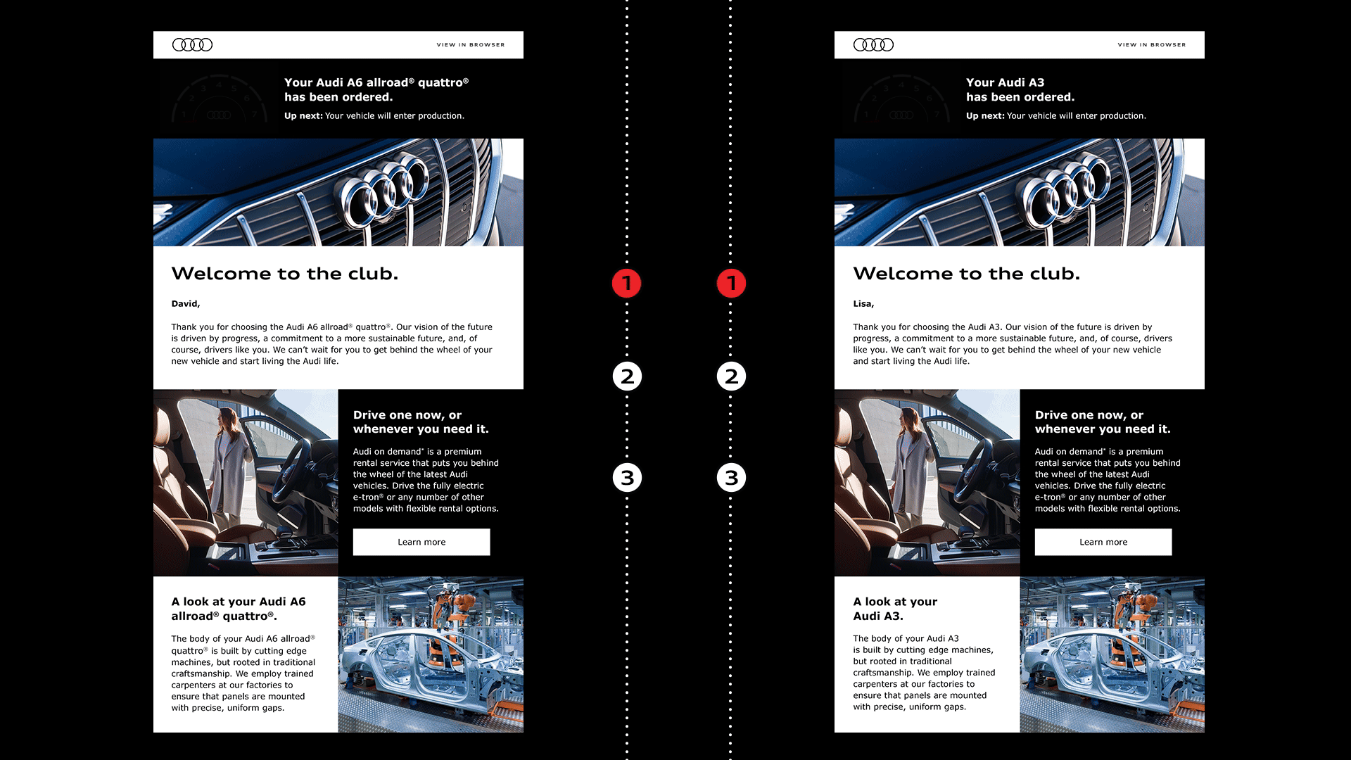 This seven email series was designed with new vehicle owners in mind - intended to guide them on an elegant, customized Audi brand journey from purchase to pick-up.