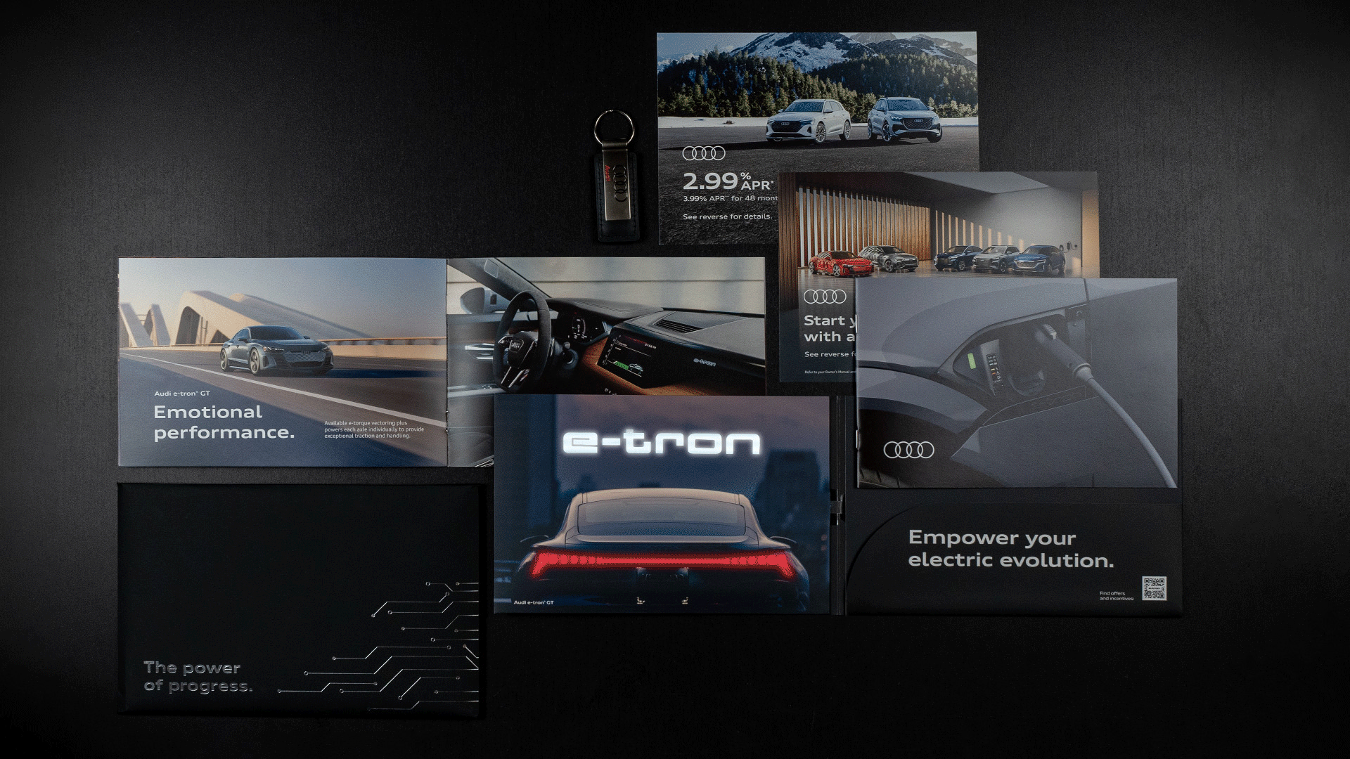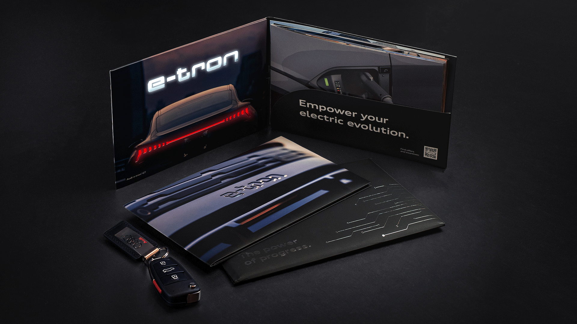 This fully custom mailer features the Audi e-tron fully electric line of vehicles. Open the mailer to see a beautiful de-boss that mimics the vehicle logo cut out. Unfold it further to be delighted by a light up message and accompanying booklet featuring the full Audi e-tron line.