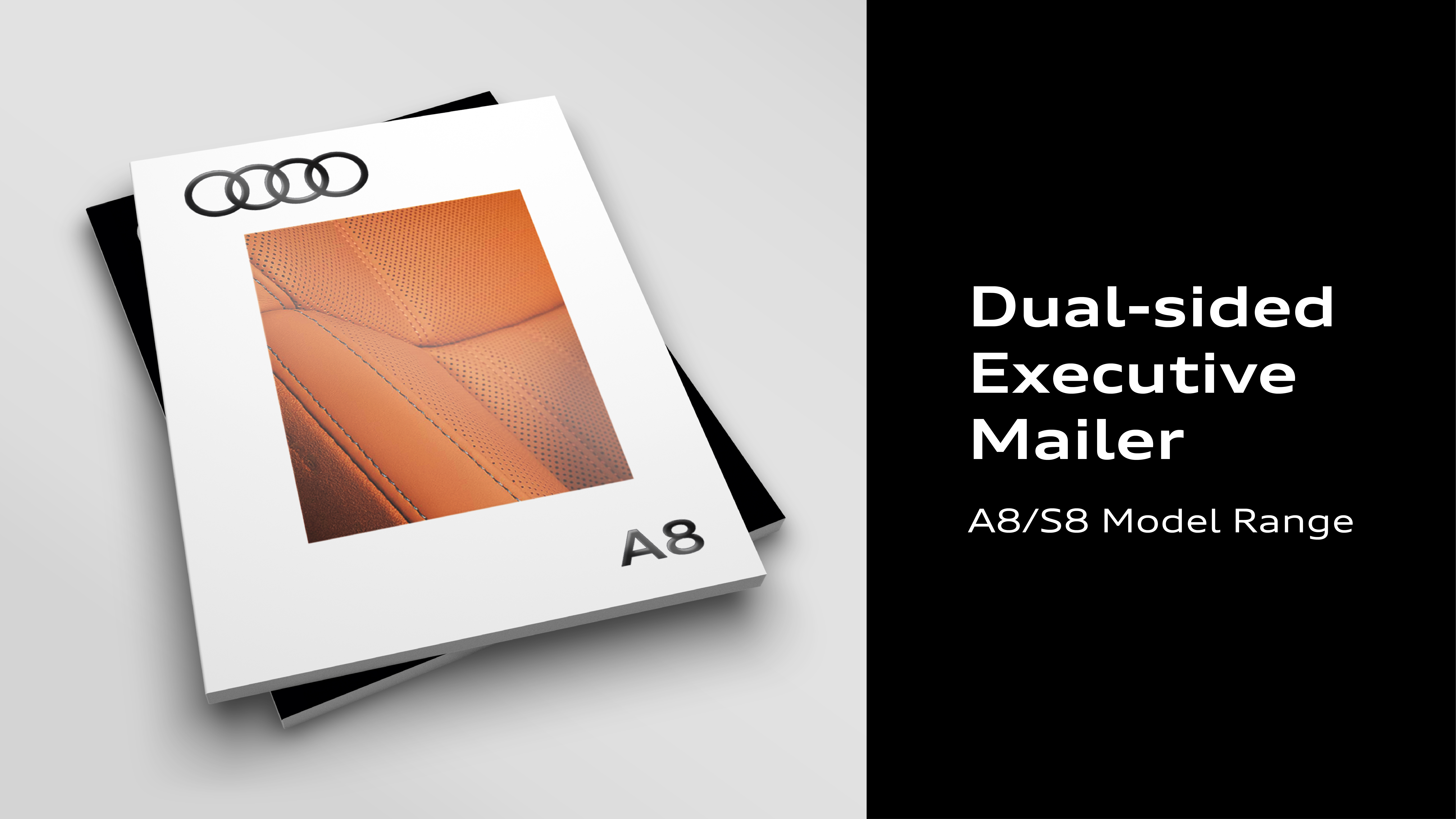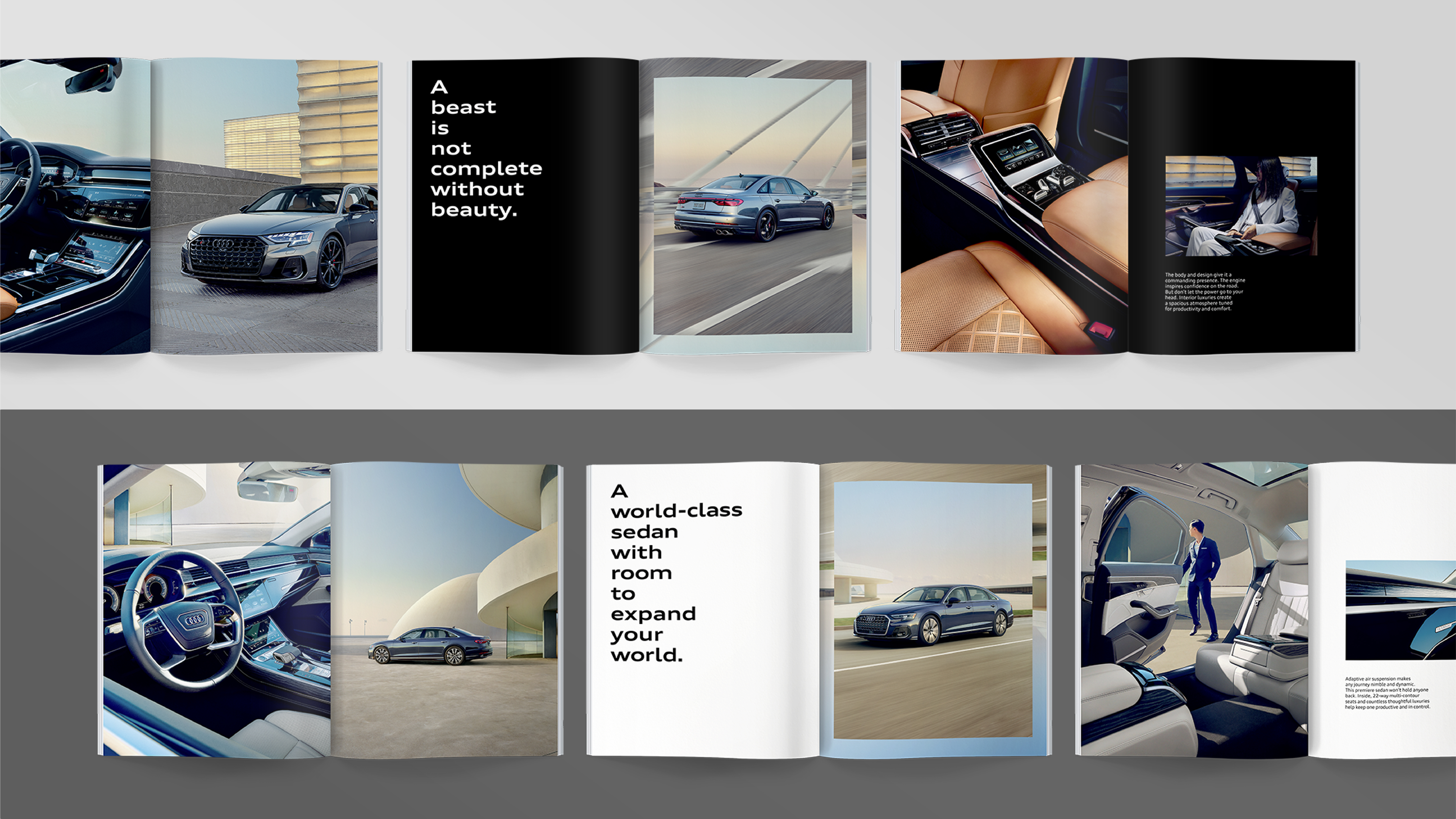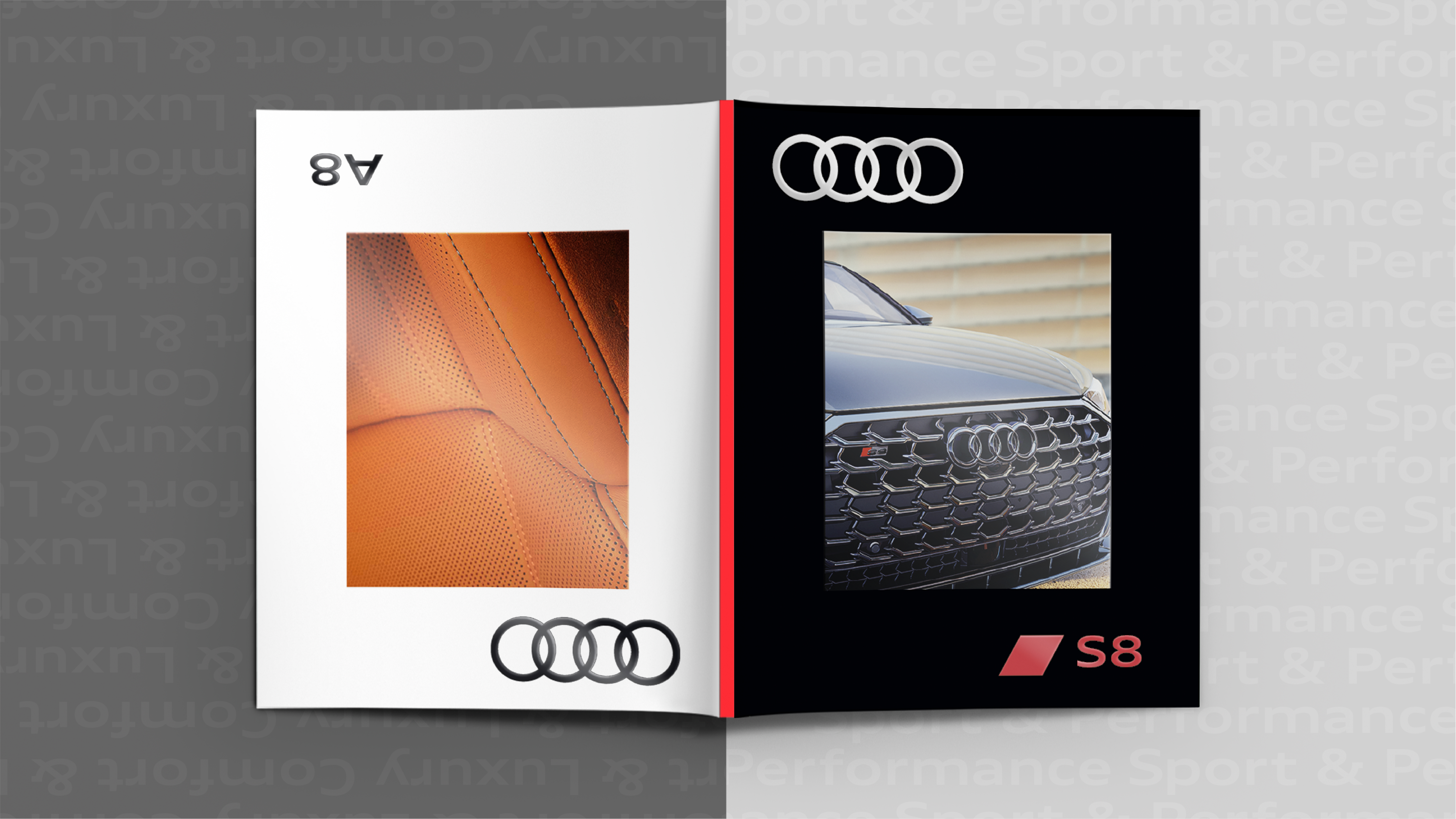 This direct mail piece was designed to be a luxury mailer - focusing on high end Audi models with a more focused, exclusive audience. Each side of the mailer highlighted a different model - the white side was the sophisticated A8, the black side was the sporty S8. These layouts mirrored the other, encouraging the user to flip the book to view the other model, and a center spread of the Audi rings on red connected the two. This 8.5 x 11 book was perfect bound and designed to feel like a high end coffee table book. A more editorial approach, as well as special coatings and printing techniques, were used throughout.
